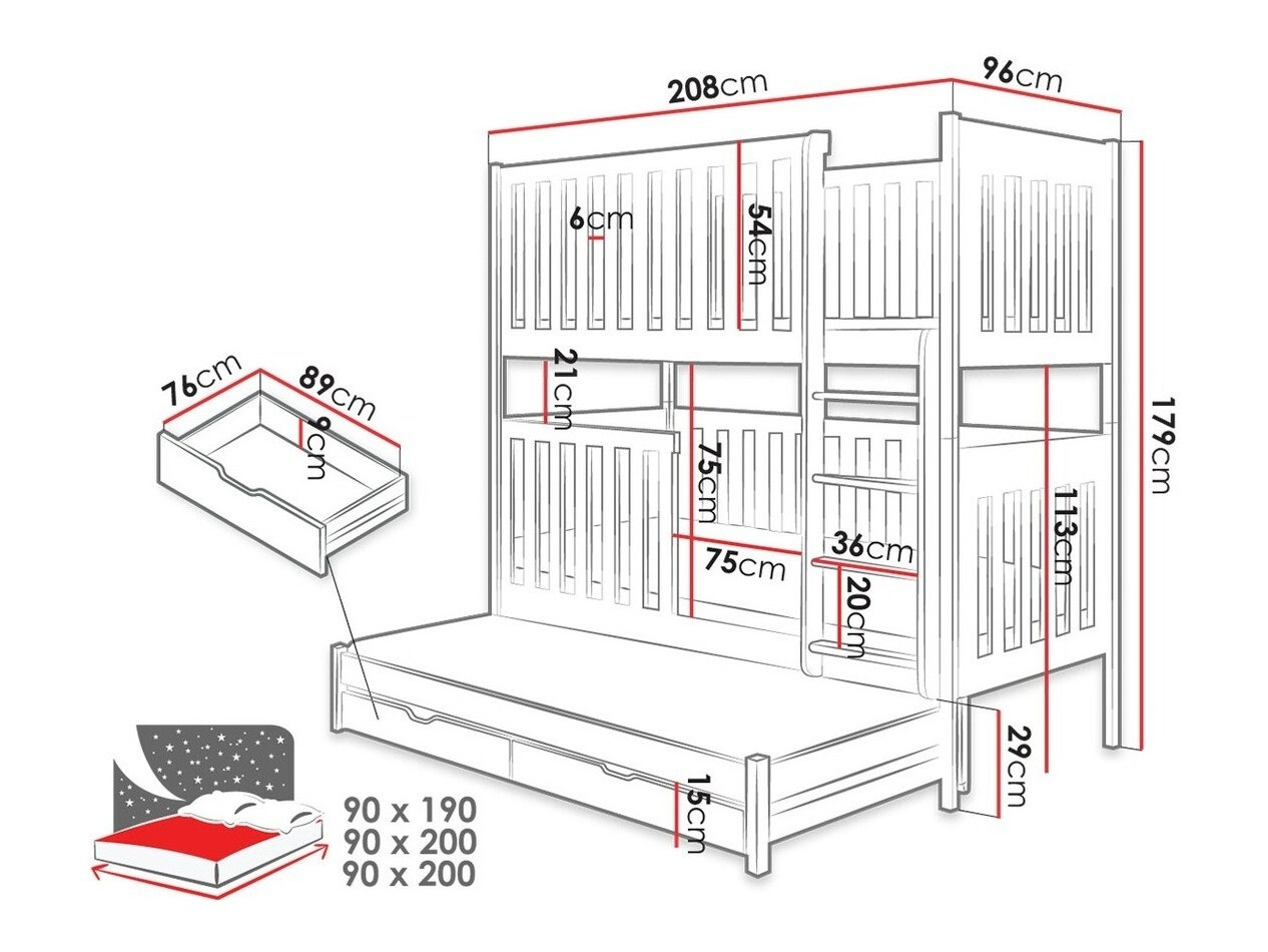 Wir sind sehr voll mit Betten, und die Kinder sind begeistert. Die Stoßfänger sind genau so, wie wir es wollten – hoch und der Abstand zwischen den Gittern gering. Die Treppe ist wieder so, wie wir es uns gewünscht haben - der Abstand zwischen den Stufen ist perfekt, um von Kindern benutzt zu werden (unsere sind 4,7 und 1,9 Jahre alt). Und obwohl es sich um ein Etagenbett handelt, das auch ein drittes Bett hat, wie eine Schublade, sind die 2 eingebauten Schubladen, die unter das 3. Bett kommen, extrem geräumig - wir haben es ehrlich gesagt nicht erwartet. Vielen Dank für das Produkt und die Ernsthaftigkeit.
