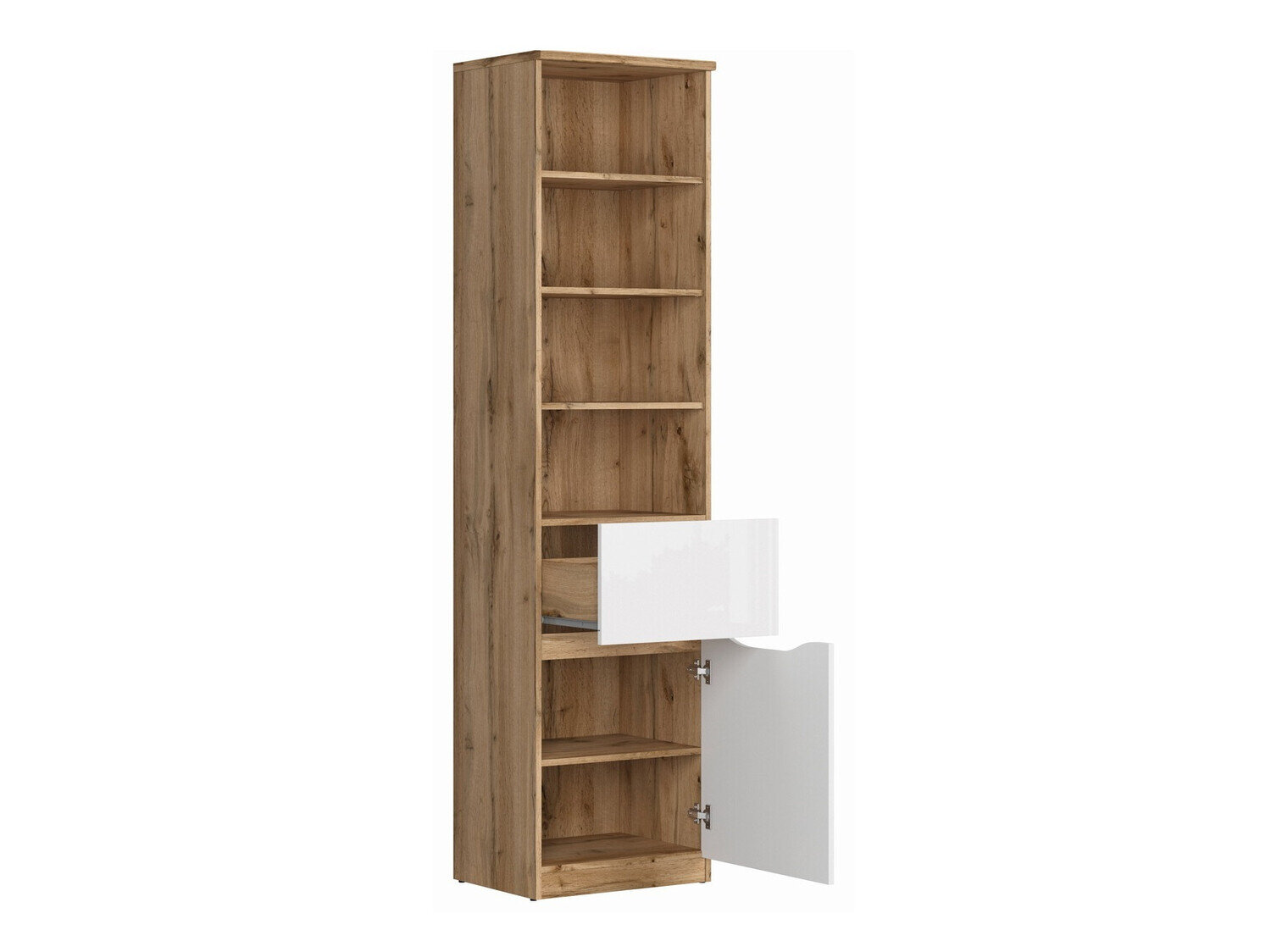 Um ein gemütliches und gleichzeitig modernes Interieur zu schaffen, ist es wichtig, auf die Farbe und Form der Möbel zu achten. Warum ist die Kollektion Ihre Aufmerksamkeit wert? Diese Möbel helfen, ein modernes Interieur mit einem leichtem skandinavischen Touch zu schaffen. Sie können die Möbel problemlos sowohl im Schlafzimmer als auch im Wohnzimmer aufstellen. Die Farbe der Eichenholzoptik «Wotan» ist ein echter Klassiker und passt perfekt in jedes Interieur. In der Kollektion wird sie mit einem glänzenden Weiss kombiniert, wodurch ein auffälliges Duo entsteht. Das Holzmuster schafft ein natürlich wirkendes Möbeldesign. Bei diesen Möbeln wird das Prinzip der versteckten Griffe angewandt, was bedeutet, dass die Form der Türen und Schubladen eine unbesorgte Nutzung ermöglicht, ohne Fingerabdrücke oder Flecken zu hinterlassen.