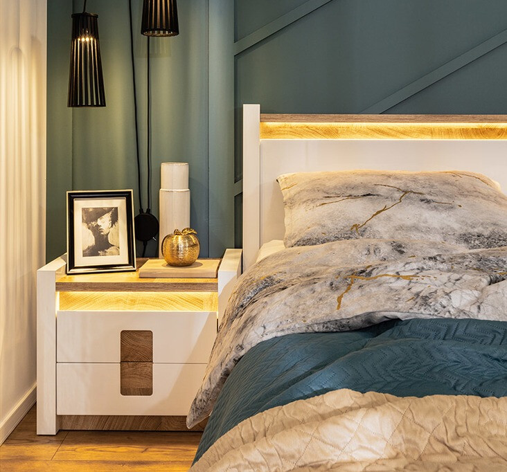 Diese Möbelkollektion ist einzigartig, da sie eine grosse Auswahl an Möbelmodellen für verschiedene Wohnbereiche bietet. Schaffen Sie sowohl im Wohnzimmer als auch im Schlafzimmer eine solide Einrichtung. Wie wäre es, wenn die Möbel auch in den Flur passen? Oder ins Büro? All das ist mit dieser Kollektion möglich. Die helle Farbpalette sieht sowohl in kleinen als auch in grossen Räumen gut aus. Die Möbelfronten werden von glänzendem Weiss dominiert, das durch holzfarbene Details perfekt ergänzt wird. Die Farbe und die Muster des Holzes kommen bei den Tischen wunderbar zur Geltung und vermitteln ein Gefühl der Gemütlichkeit. Auch die Grifflösung fällt ins Auge, die nicht nur als Griffe, sondern auch als Dekor dient. Stauraum gibt es auf jeden Fall genug, die Möbel verfügen über zahlreiche Schubladen und Ablagen. Für zusätzlichen Charme sorgt die integrierte energiesparende LED-Beleuchtung. Mit dieser Lösung geniessen Sie gemütliches Licht, das die holzfarbenen Einsätze hervorhebt. Der geräuschlose Schliessmechanismus schützt die Türen und Schubladen vor dem schnellen Schliessen.
