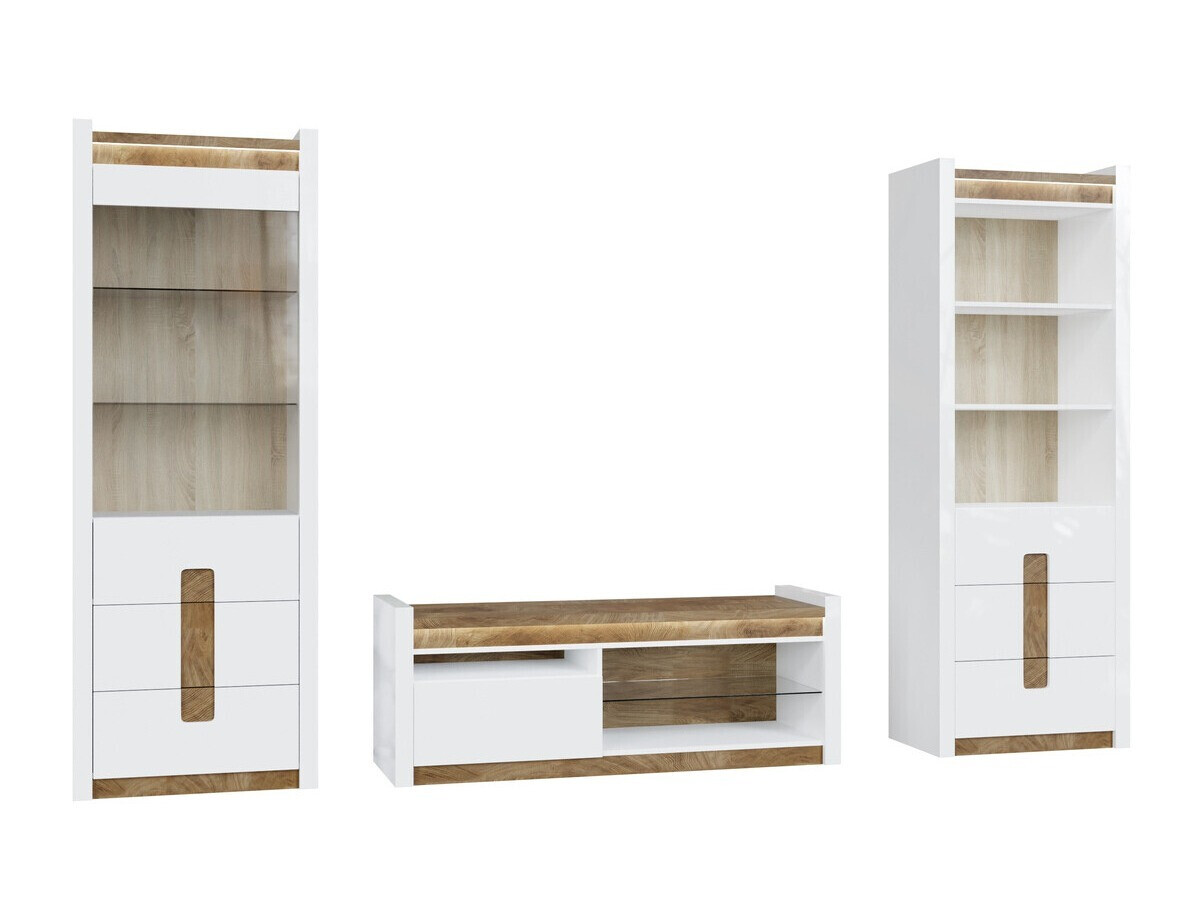 Diese Möbelkollektion ist einzigartig, da sie eine grosse Auswahl an Möbelmodellen für verschiedene Wohnbereiche bietet. Schaffen Sie sowohl im Wohnzimmer als auch im Schlafzimmer eine solide Einrichtung. Wie wäre es, wenn die Möbel auch in den Flur passen? Oder ins Büro? All das ist mit dieser Kollektion möglich. Die helle Farbpalette sieht sowohl in kleinen als auch in grossen Räumen gut aus. Die Möbelfronten werden von glänzendem Weiss dominiert, das durch holzfarbene Details perfekt ergänzt wird. Die Farbe und die Muster des Holzes kommen bei den Tischen wunderbar zur Geltung und vermitteln ein Gefühl der Gemütlichkeit. Auch die Grifflösung fällt ins Auge, die nicht nur als Griffe, sondern auch als Dekor dient. Stauraum gibt es auf jeden Fall genug, die Möbel verfügen über zahlreiche Schubladen und Ablagen. Für zusätzlichen Charme sorgt die integrierte energiesparende LED-Beleuchtung. Mit dieser Lösung geniessen Sie gemütliches Licht, das die holzfarbenen Einsätze hervorhebt. Der geräuschlose Schliessmechanismus schützt die Türen und Schubladen vor dem schnellen Schliessen.