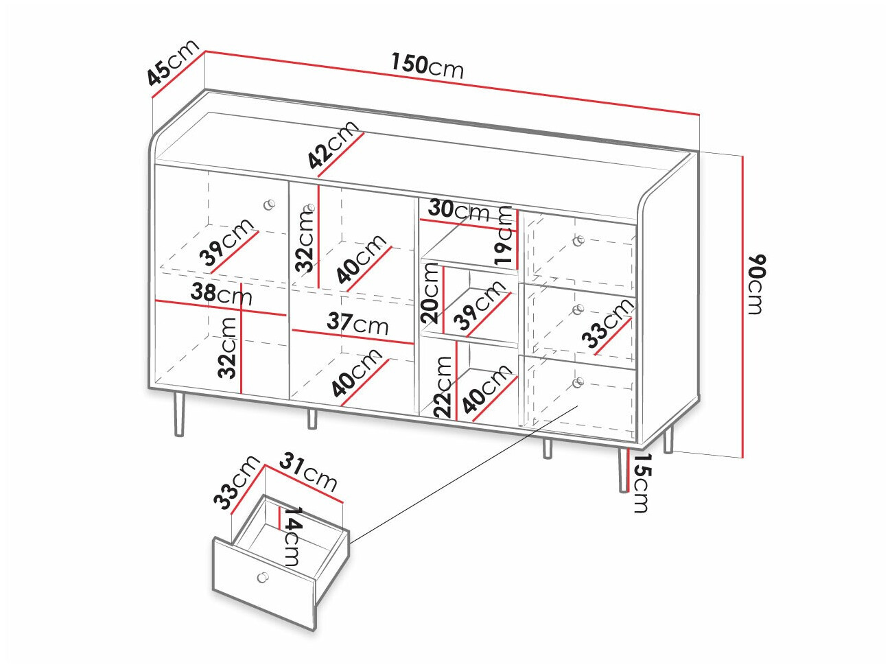 Die Möbel sind aus laminierten Spanplatten gefertigt, deren Kanten mit einem speziellen ABS-Band geschützt sind. Dank der hochwertigen ABS-Kanten sind die Möbel stossfester. Die Türen und Schubladen haben einen geräuschlosen Schliessmechanismus, dank dem sich die Schubladen und Türen leicht und ohne Geräusch schliessen. Die Fronten der Möbel sind mit kleinen schwarzen Metallgriffen verziert, die zu den Möbeln dieser eleganten Kollektion passen. Die zierlichen Metallbeine verleihen den unregelmässig geformten Möbeln Originalität und Stil.