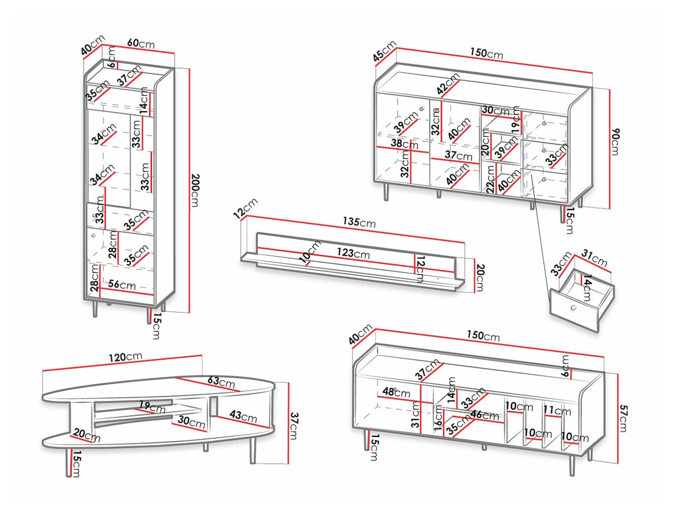 Die Möbel sind aus laminierten Spanplatten gefertigt, deren Kanten mit einem speziellen ABS-Band geschützt sind. Dank der hochwertigen ABS-Kanten sind die Möbel stossfester. Die Türen und Schubladen haben einen geräuschlosen Schliessmechanismus, dank dem sich die Schubladen und Türen leicht und ohne Geräusch schliessen. Die Fronten der Möbel sind mit kleinen schwarzen Metallgriffen verziert, die zu den Möbeln dieser eleganten Kollektion passen. Die zierlichen Metallbeine verleihen den unregelmässig geformten Möbeln Originalität und Stil.