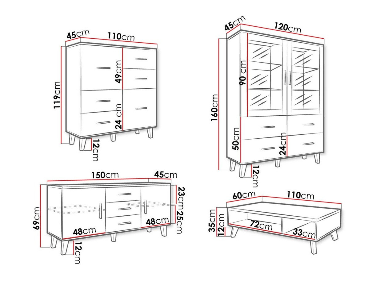 Die Farben der Fronten verleihen dem Wohnzimmer Harmonie und Gemütlichkeit. Die Möbelkollektion ist in mehreren Farbvarianten erhältlich: Eichenholzoptik «Wotan» mit Weiss oder Weiss mit hellen Eichenholzakzenten. Die Kollektion umfasst alle wesentlichen Möbel für das Wohnzimmer: Couch- und Fernsehtische, eine Kommode, einen Schrank, eine Vitrine und einen Kleiderschrank.