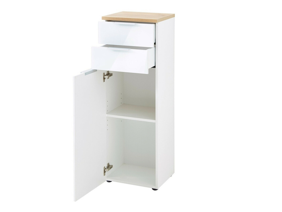 Mit dieser Möbelkollektion können Sie ein modernes Badezimmer einrichten. Die Möbel dieser Kollektion werden durch Metallgriffe in minimalistischem Design ergänzt, die sich perfekt in das Möbeldesign einfügen und fast nicht mehr wahrnehmbar sind. Die Badezimmerkollektion kombiniert matte Eichenholzoptik «Navarra» oder graphitfarbene Oberflächen mit glänzendem Weiss. Sie können Möbel aus dieser Kollektion in mehreren Farbvarianten wählen. Die Möbel sind leicht zu pflegen, da sie mit einem farblosen Material überzogen sind, das sie vor kleinen Kratzern schützt und eine einfache Reinigung von angesammeltem Schmutz ermöglicht. Die Kanten der Kollektion sind mit einem Abschlussband aus starkem Kunststoff versehen, das die Möbel vor kleinen Beschädigungen schützt. Die Schubladen und Türen sind mit einem geräuschlosen Schliessmechanismus ausgestattet, der verhindert, dass sie sich schnell schliessen. Funktionalität und Komfort sind wesentliche Merkmale dieser in Deutschland hergestellten Kollektion. Gestalten Sie mit dieser Kollektion ein modernes Bad.