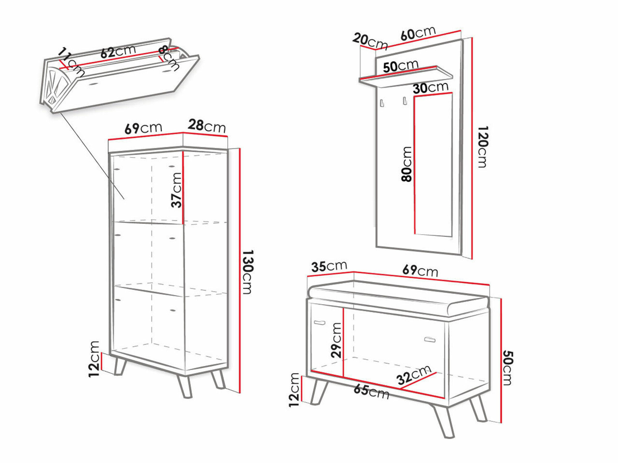 130 x 69 x 28; 50 x 69 x 35 cm