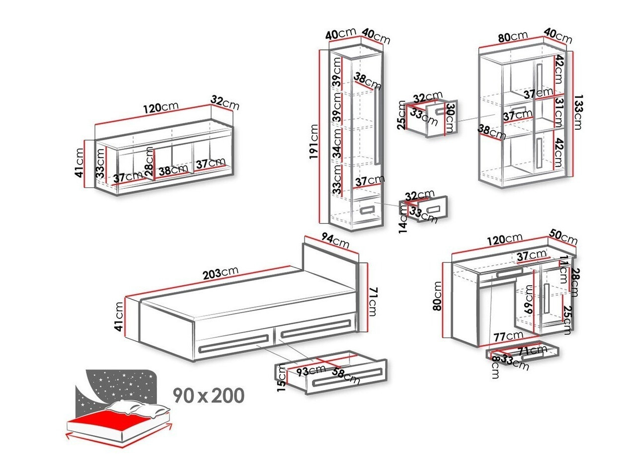 Kinderzimmer-Set Merevari 108 (Weiss + Weiss glänzend + Grau)