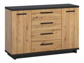 Diese Möbelkollektion bietet Möbel für das Wohn- und Schlafzimmer. Modernes Design und elegante Linien ergänzen sich zu einem perfekten Ganzen. Die Kollektion besticht durch ihre warmen Farben und Holzmuster. Die schwarzen Möbelplatten in Matt passen zu den Fronten in Eichenholzoptik. Diese Farbkombination ergänzt sich und unterstreicht die Form der Möbel. In Vitrinen wird gehärtetes Glas verwendet, das fester ist als gewöhnliches Glas. Ein Bett mit einem exklusiven Design wird zum Highlight des Schlafzimmers. Weiches Kopfteil, Bettkasten, Gasdruckfedern, alles was Sie für Ihre perfekte Erholung brauchen. Die Möbelkanten aus dieser Kollektion sind mit einem Abschlussband zum Schutz der Kanten ausgestattet.