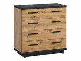 Diese Möbelkollektion bietet Möbel für das Wohn- und Schlafzimmer. Modernes Design und elegante Linien ergänzen sich zu einem perfekten Ganzen. Die Kollektion besticht durch ihre warmen Farben und Holzmuster. Die schwarzen Möbelplatten in Matt passen zu den Fronten in Eichenholzoptik. Diese Farbkombination ergänzt sich und unterstreicht die Form der Möbel. In Vitrinen wird gehärtetes Glas verwendet, das fester ist als gewöhnliches Glas. Ein Bett mit einem exklusiven Design wird zum Highlight des Schlafzimmers. Weiches Kopfteil, Bettkasten, Gasdruckfedern, alles was Sie für Ihre perfekte Erholung brauchen. Die Möbelkanten aus dieser Kollektion sind mit einem Abschlussband zum Schutz der Kanten ausgestattet.