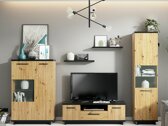 Diese Möbelkollektion bietet Möbel für das Wohn- und Schlafzimmer. Modernes Design und elegante Linien ergänzen sich zu einem perfekten Ganzen. Die Kollektion besticht durch ihre warmen Farben und Holzmuster. Die schwarzen Möbelplatten in Matt passen zu den Fronten in Eichenholzoptik. Diese Farbkombination ergänzt sich und unterstreicht die Form der Möbel. In Vitrinen wird gehärtetes Glas verwendet, das fester ist als gewöhnliches Glas. Ein Bett mit einem exklusiven Design wird zum Highlight des Schlafzimmers. Weiches Kopfteil, Bettkasten, Gasdruckfedern, alles was Sie für Ihre perfekte Erholung brauchen. Die Möbelkanten aus dieser Kollektion sind mit einem Abschlussband zum Schutz der Kanten ausgestattet.
