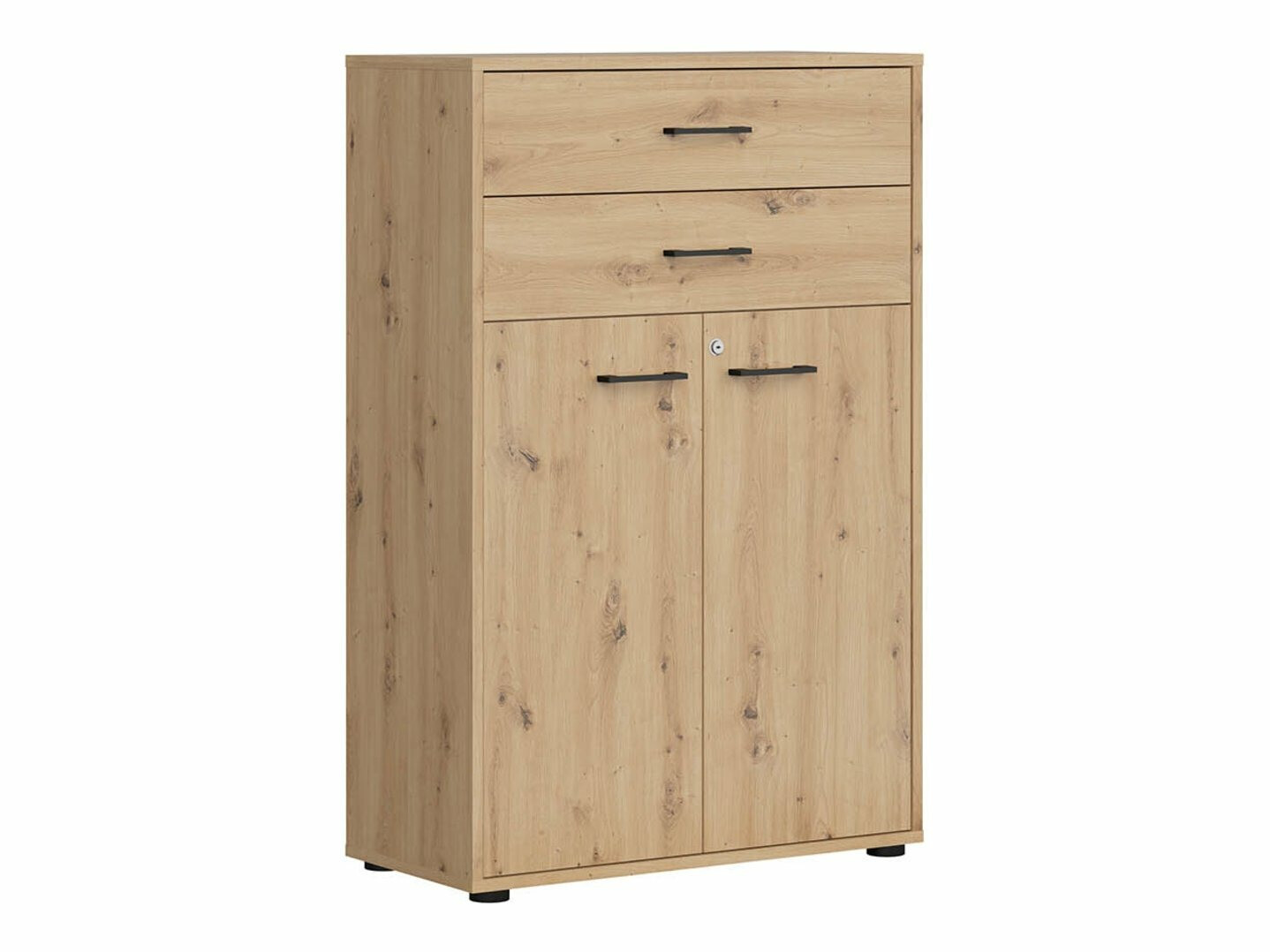 Die Kombination ausEichenholzoptik «Artisan» und Schwarz verleiht den Möbeln Modernität. Die minimalistischen schwarzen Kunststoffgriffe fügen sich perfekt in das Design ein. Die Möbel der Kollektion bestehen aus laminierten Spanplatten mit einer kratzfesten Oberfläche. Mit dieser Schutzfolie werden die Möbel nicht nur kratzfest, sondern auch besser vor Feuchtigkeit oder Flecken geschützt. Der in den Möbeln eingebaute geräuschlosen Schliessmechanismus verbessert das Benutzererlebnis und sorgt für ein geräuschloses Öffnen und Schliessen der Türen und Schubladen.