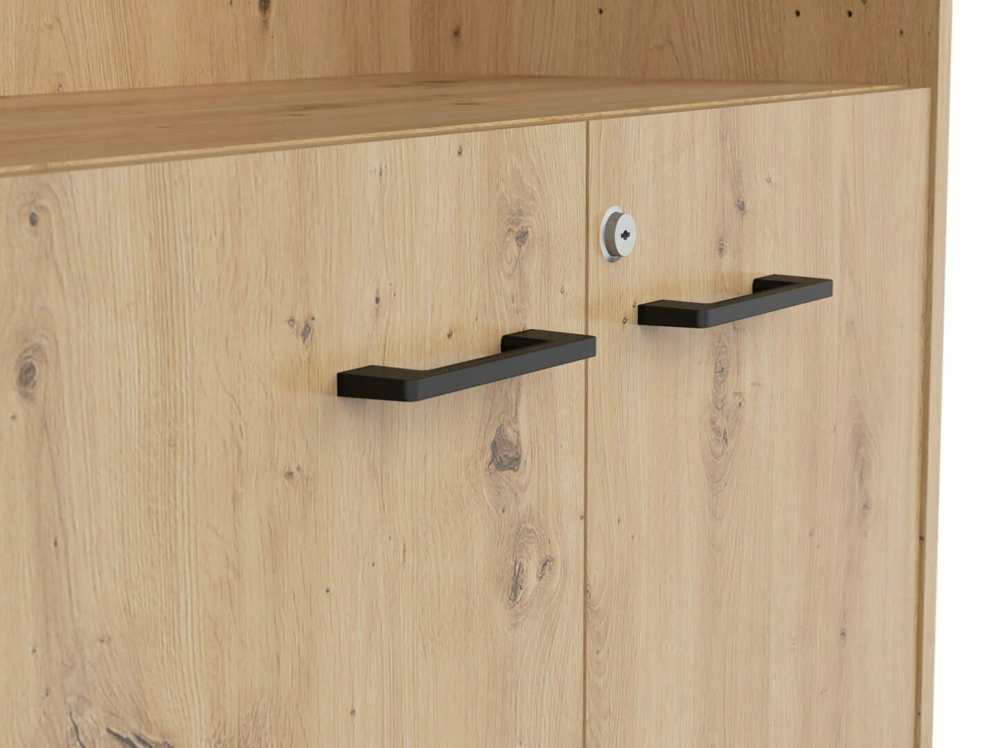 Die Kombination ausEichenholzoptik «Artisan» und Schwarz verleiht den Möbeln Modernität. Die minimalistischen schwarzen Kunststoffgriffe fügen sich perfekt in das Design ein. Die Möbel der Kollektion bestehen aus laminierten Spanplatten mit einer kratzfesten Oberfläche. Mit dieser Schutzfolie werden die Möbel nicht nur kratzfest, sondern auch besser vor Feuchtigkeit oder Flecken geschützt. Der in den Möbeln eingebaute geräuschlosen Schliessmechanismus verbessert das Benutzererlebnis und sorgt für ein geräuschloses Öffnen und Schliessen der Türen und Schubladen.