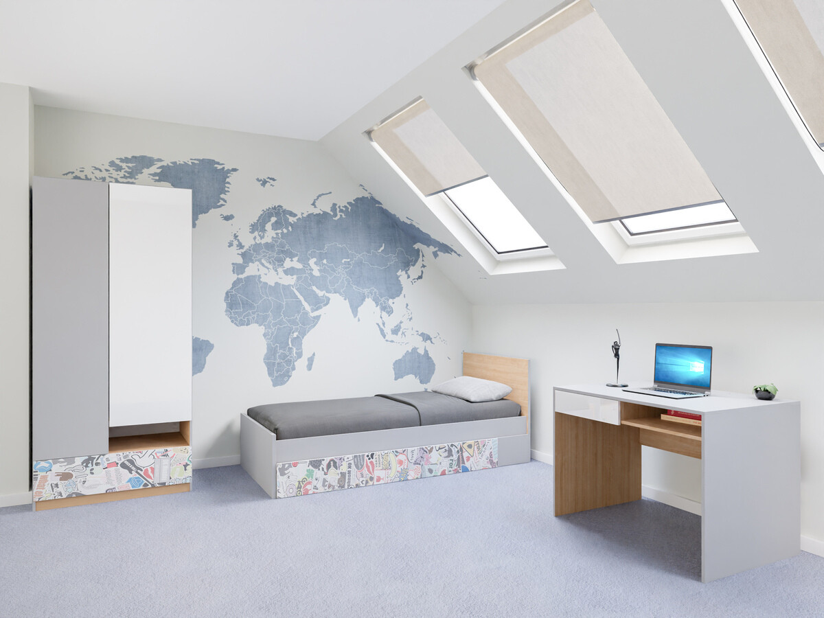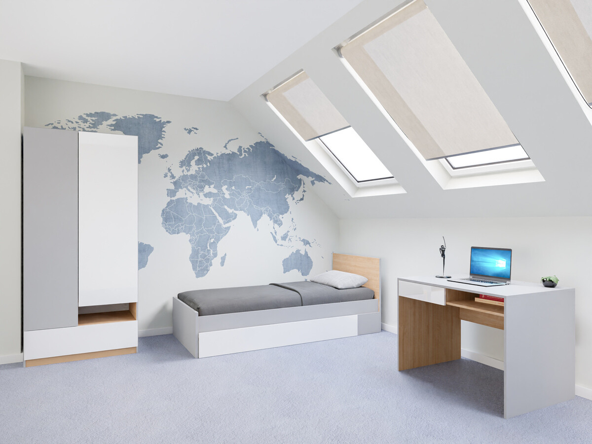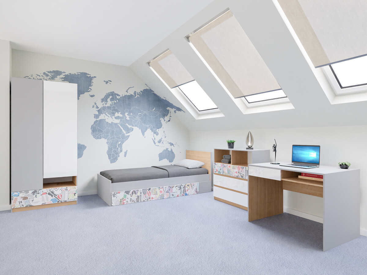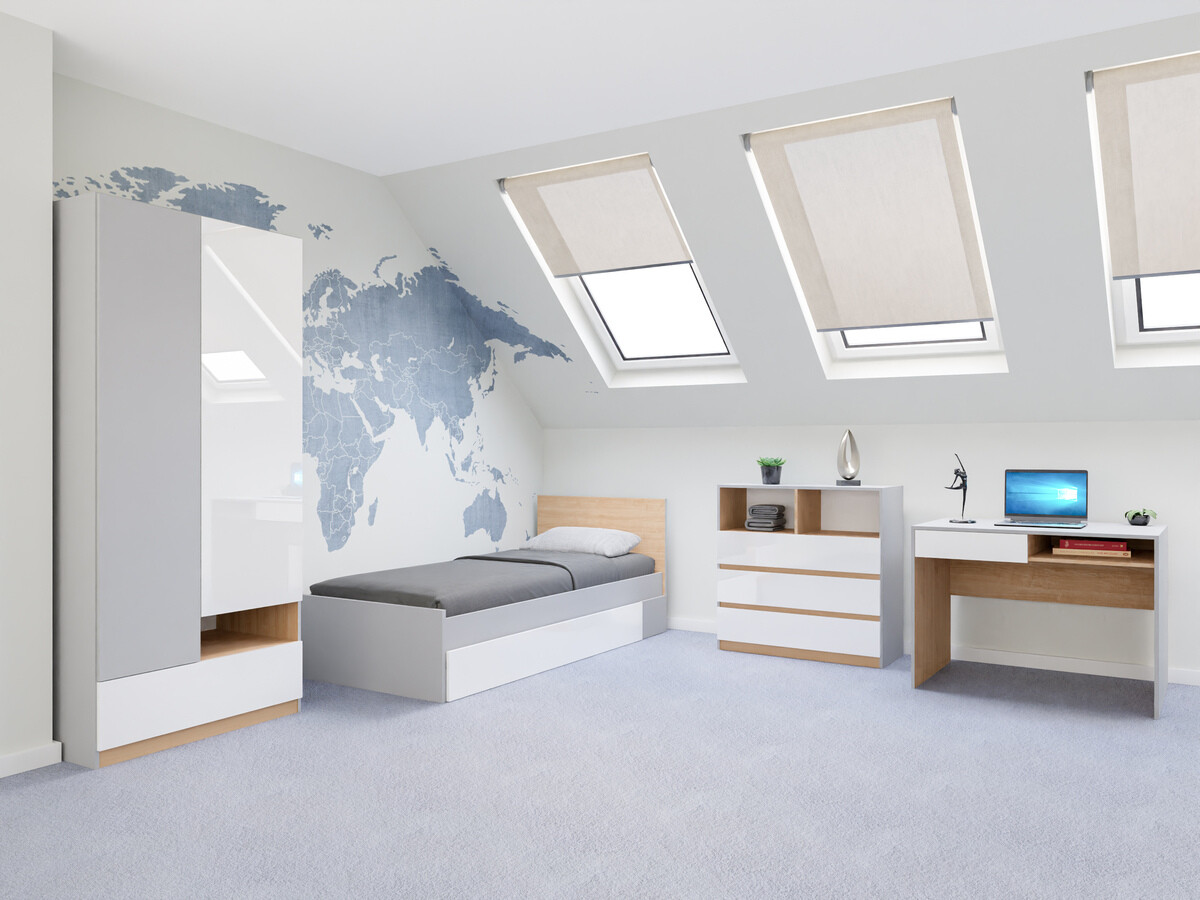 In einem Kinder- oder Jugendzimmer ist es wichtig, ein Gleichgewicht zwischen Design und Funktionalität zu schaffen. In diesem Raum kann man seiner Fantasie freien Lauf lassen, ohne Angst vor grellen Farben oder anderen Designelementen zu haben. Innovation und Kreativität gehen bei dieser Kollektion Hand in Hand. Die Möbelkollektion bietet klare Formen in Hellgrau, Eiche und glänzendem Weiss. Die Möbel kombinieren neutrale Farben und bunte Elemente, die das Design als Akzent ergänzen und sich perfekt in das Gesamtbild einfügen. Für Personen, die bunte Elemente eher nicht mögen, finden sich in der Kollektion auch Möbel in neutralen Farben. Die Flexibilität wird durch geräumige Möbel mit offenen und geschlossenen Bereichen gewährleistet. Die Oberflächen der Möbel sind mit einem farblosen Material überzogen, das vor kleinen Kratzern schützt. In den Türen und Schubladen ist ein geräuschloser Schliessmechanismus integriert, der für zusätzlichen Komfort bei der Verwendung der Möbel sorgt. Mit der Möbelkollektion lässt sich ganz einfach ein modernes und funktionales Jugendzimmer einrichten.