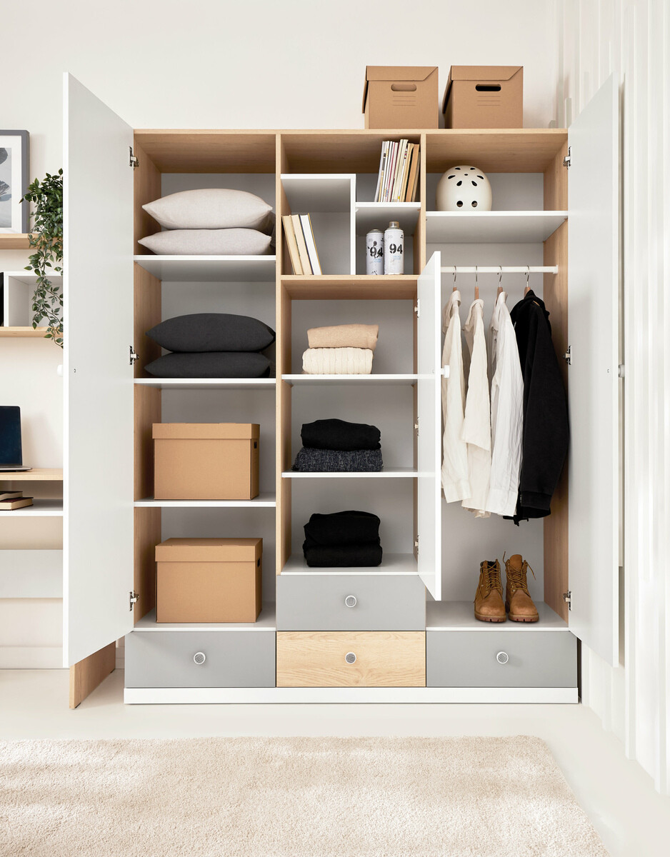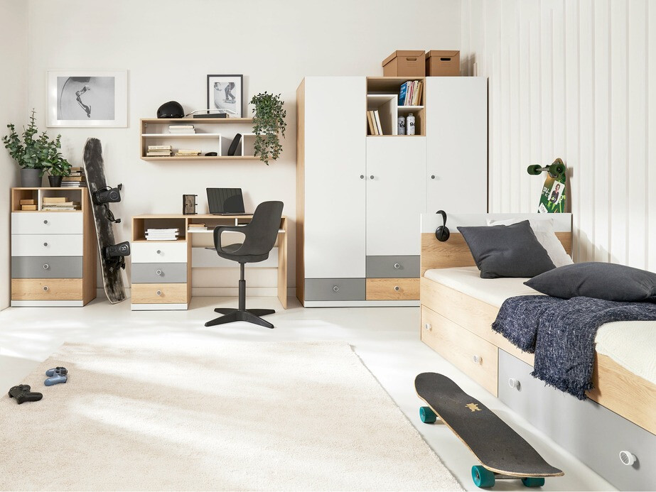 Das Einrichten eines Jugendzimmers kann zu einer echten Herausforderung werden. Hier sind Möbelkollektionen für das Zimmer des jungen Menschen praktisch. Möbelsets sind eine bequeme Wahl für alle, die Zeit sparen wollen und auf der Suche nach Möbeln sind, die einen soliden Einrichtungsstil bieten. Diese Möbelkollektion besticht durch ihre Pastellfarben und einfachen Formen. Das Möbeldesign kombiniert drei Farben: weiss, grau und Eichenholzoptik. Für das Design wurden kleine, runde Griffe gewählt, die das minimalistische und verspielte Design der Möbel noch betonen. Die Möbel dieser Kollektion werden einen Raum schaffen, in dem junge Menschen gerne Zeit mit Freunden verbringen oder auch lernen können. Das Möbelset enthält ein Regal, ein Bett, eine Kommode, einen Kleiderschrank und alles, was man in einem Jugendzimmer braucht. Das Möbeldesign ist gut durchdacht: Hier finden Sie Fächer, Regale und Schubladen in verschiedenen Grössen, die eine sehr bequeme Lösung für Ordnung im Raum darstellen. Die Kanten der Möbel sind mit einem Abschlussband versehen, das aus starkem Kunststoff besteht, der zum Schutz der Kanten der Platten verwendet wird. Das Design dieser Möbelkollektion ist perfekt für Kinder jeden Alters.