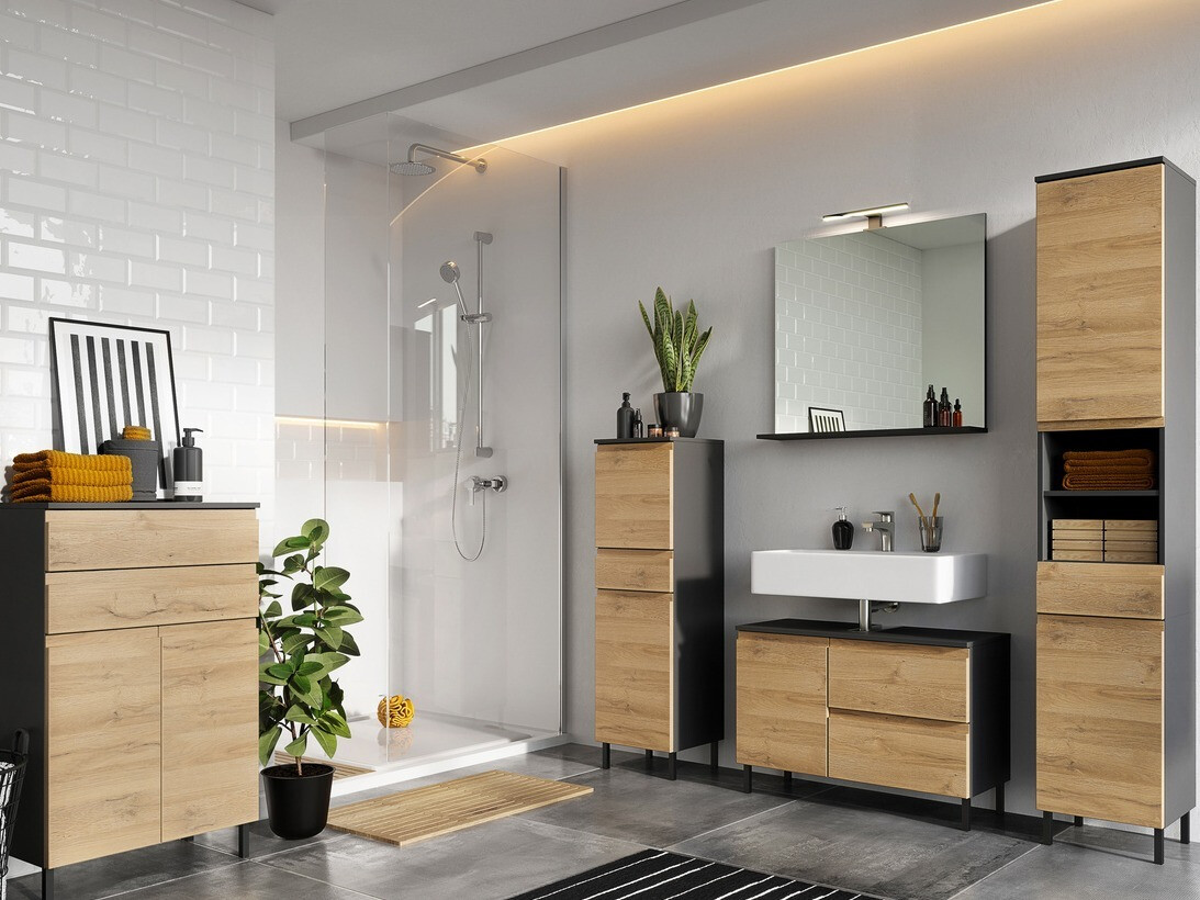 Die Badmöbel-Kollektion wird Ihnen helfen, Ihr Bad modern einzurichten. Bei dieser Möbelkollektion können Sie aus mehreren Farbvarianten wählen. Die Möbel der Kollektion können sowohl dunkler als auch heller sein. Die Kollektion wird durch Metallfüsse ergänzt, die dem Raum Leichtigkeit verleihen. Alle Möbel der Kollektion sind mit einem farblosen Material überzogen, das die Möbel vor kleinen Kratzern schützt. Die kunststoffummantelten Kanten der Möbel sind widerstandsfähig gegen mechanische Beschädigungen, die durch den täglichen Gebrauch entstehen. Die Schubladen und Türen sind mit einem geräuschlosen Schliessmechanismus ausgestattet, der verhindert, dass sie sich schnell schliessen. Funktionalität und Bequemlichkeit sind wesentliche Merkmale dieser in Deutschland hergestellten Kollektion. Die Möbelkollektion verfügt über verstellbare Einlegeböden, die es Ihnen ermöglichen, die bequemste Art der Aufbewahrung von Gegenständen zu gestalten. Gestalten Sie mit dieser Möbelkollektion ein modernes Badezimmer.