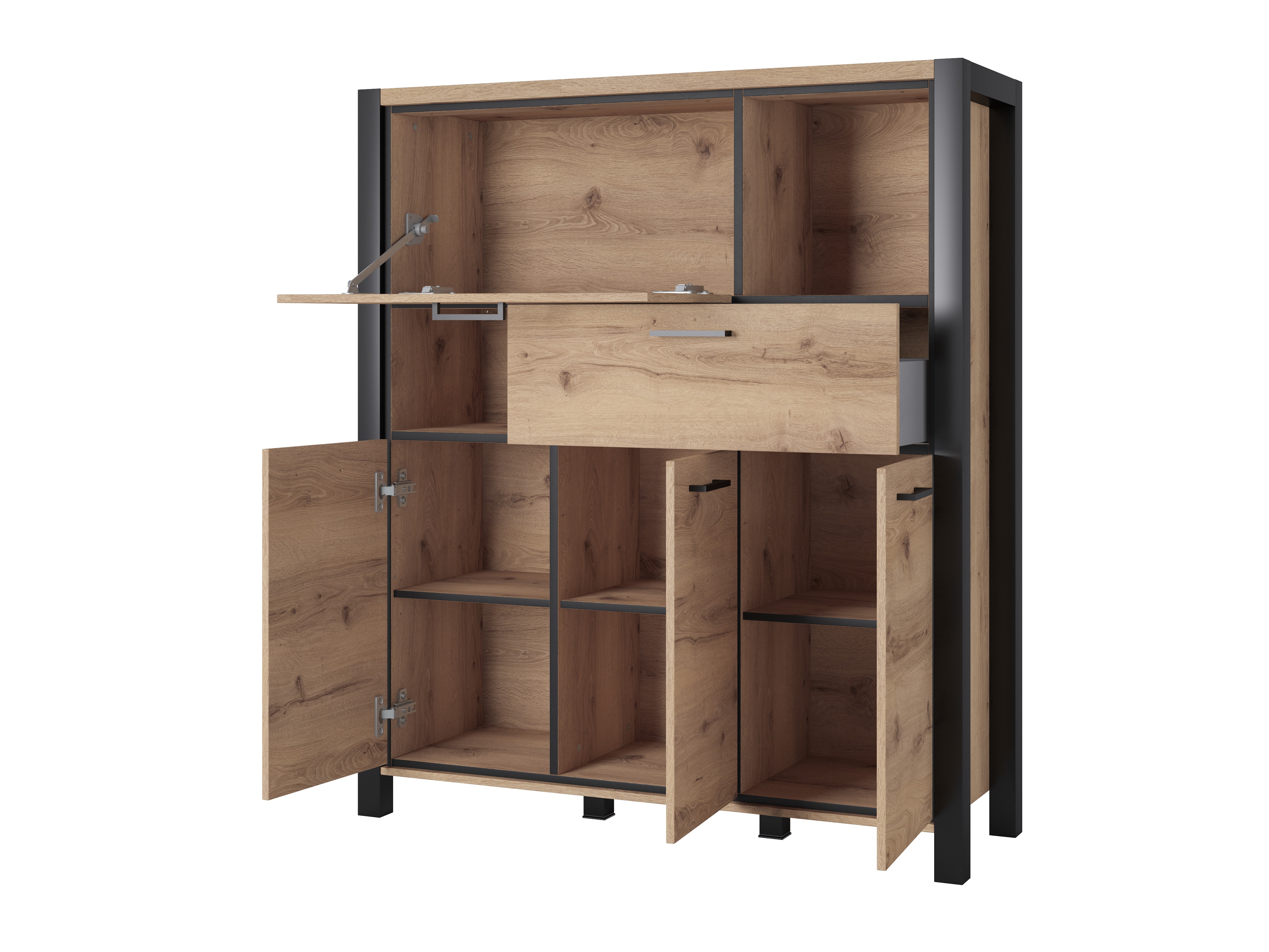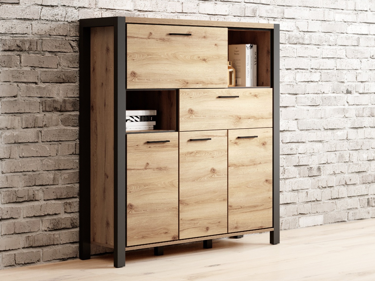 Diese Kollektion ist für Liebhaber des industriellen Einrichtungsstils bestimmt. Die Metallgriffe werden mit hellen eichenholzfarbenen Fronten kombiniert, die einen Hauch von Holzmaserung zeigen. Die Form der Griffe fügt sich perfekt in das Gesamtdesign ein. Die Möbel werden durch mattschwarze Kanten hervorgehoben, die die schlichte Silhouette der Möbel unterstreichen. Eines der Hauptmerkmale der Kollektion ist die Geräumigkeit. Extrem geräumige Möbelteile sorgen dafür, dass alle Dinge ihren Platz finden. Mit dieser Kollektion können Sie ohne grossen Aufwand ein industrielles Ambiente für Ihr Zuhause gestalten. Schaffen Sie eine noch gemütlichere Atmosphäre zu Hause, indem Sie zusätzlich eine LED-Beleuchtung bestellen.
