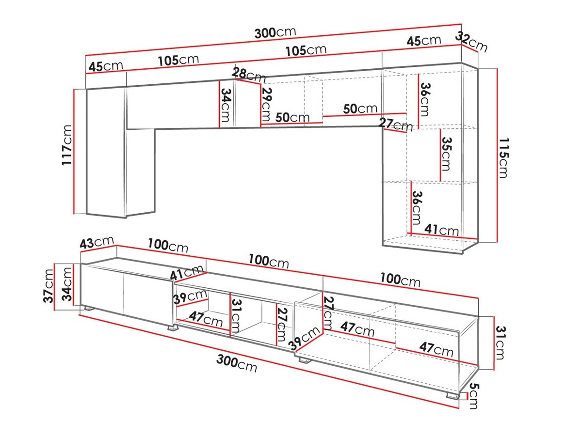 34 x 210 x 32; 117 x 45 x 32 cm