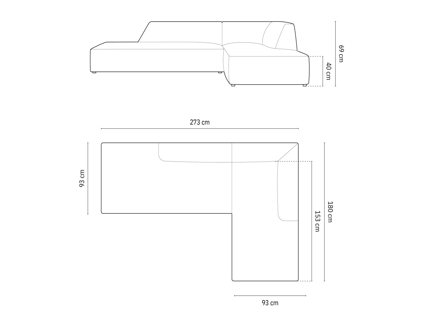 Wenn Sie das Sofa von vorne betrachten, befindet sich der verlängerte Teil bzw. die Ecke der rechtsseitigen Option auf Ihrer rechten Seite. Die gewählte Eckoption sollte den Fluss des Raums verbessern und eine einfache Bewegung innerhalb des Raums ermöglichen.