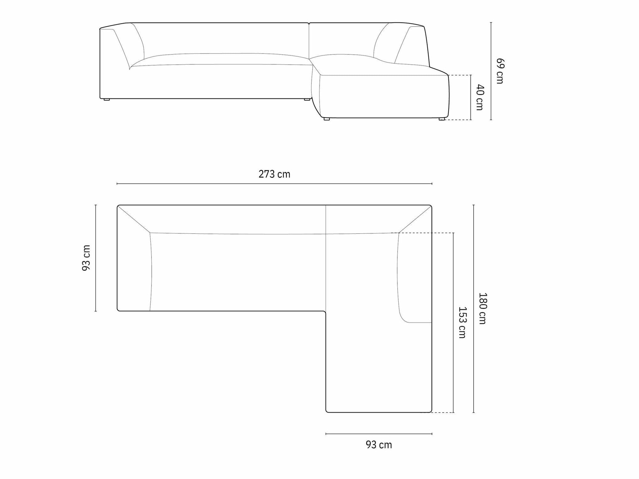 Wenn Sie das Sofa von vorne betrachten, befindet sich der verlängerte Teil bzw. die Ecke der rechtsseitigen Option auf Ihrer rechten Seite. Die gewählte Eckoption sollte den Fluss des Raums verbessern und eine einfache Bewegung innerhalb des Raums ermöglichen.