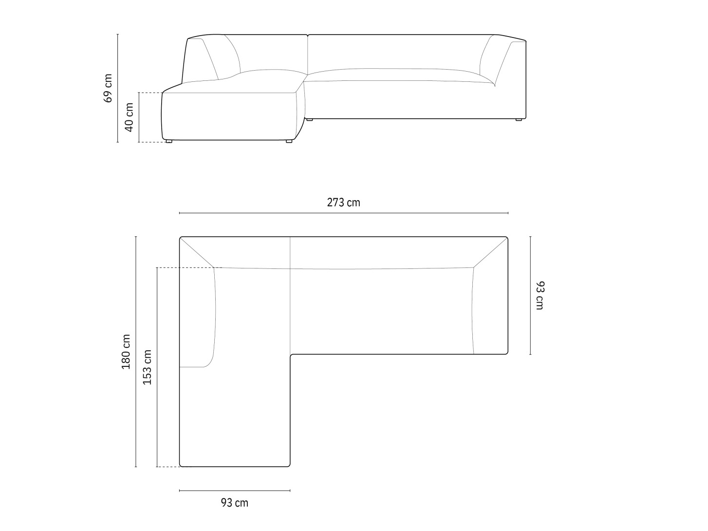 Wenn Sie das Sofa von vorne betrachten, befindet sich der verlängerte Teil bzw. die Ecke der linksseitigen Option auf Ihrer linken Seite. Die gewählte Eckoption sollte den Fluss des Raums verbessern und eine einfache Bewegung innerhalb des Raums ermöglichen.