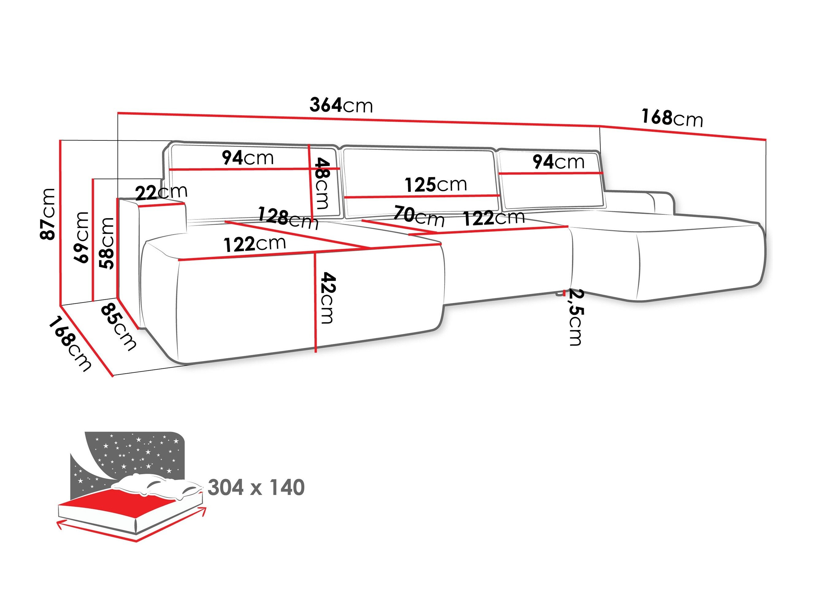 87 cm  364 cm  168 cm