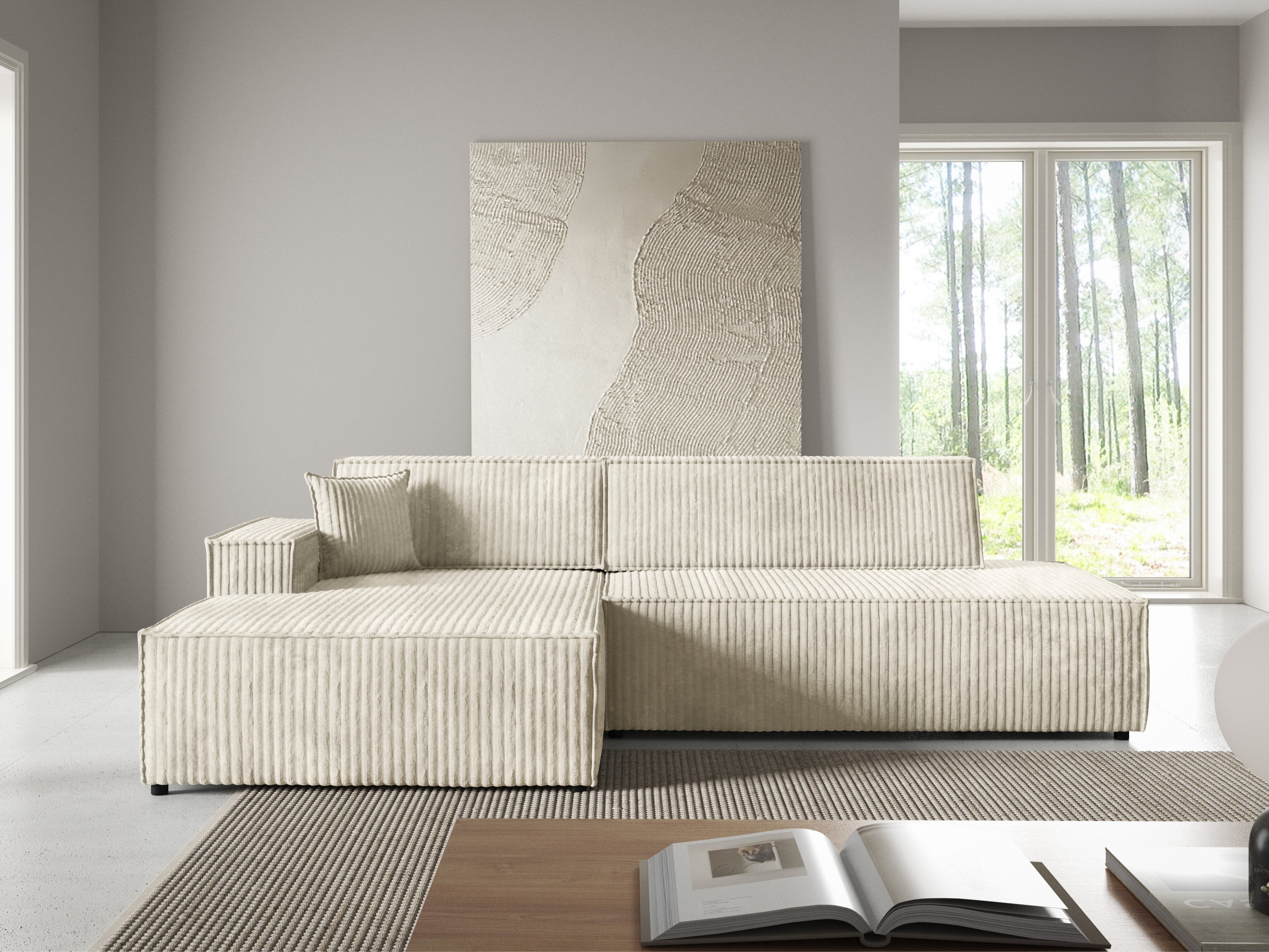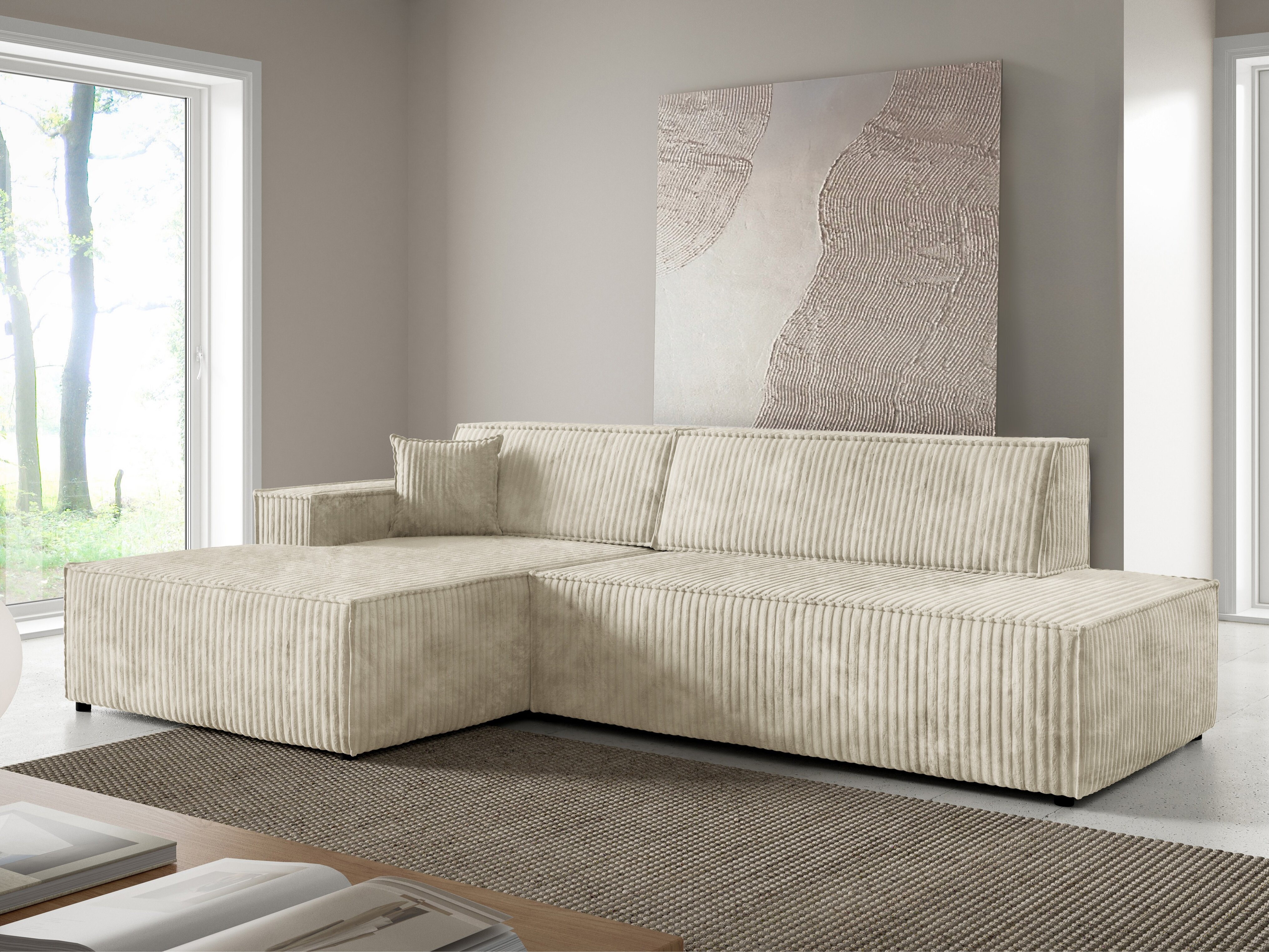 Wenn Sie das Sofa von vorne betrachten, befindet sich der verlängerte Teil bzw. die Ecke der linksseitigen Option auf Ihrer linken Seite. Die gewählte Eckoption sollte den Fluss des Raums verbessern und eine einfache Bewegung innerhalb des Raums ermöglichen.