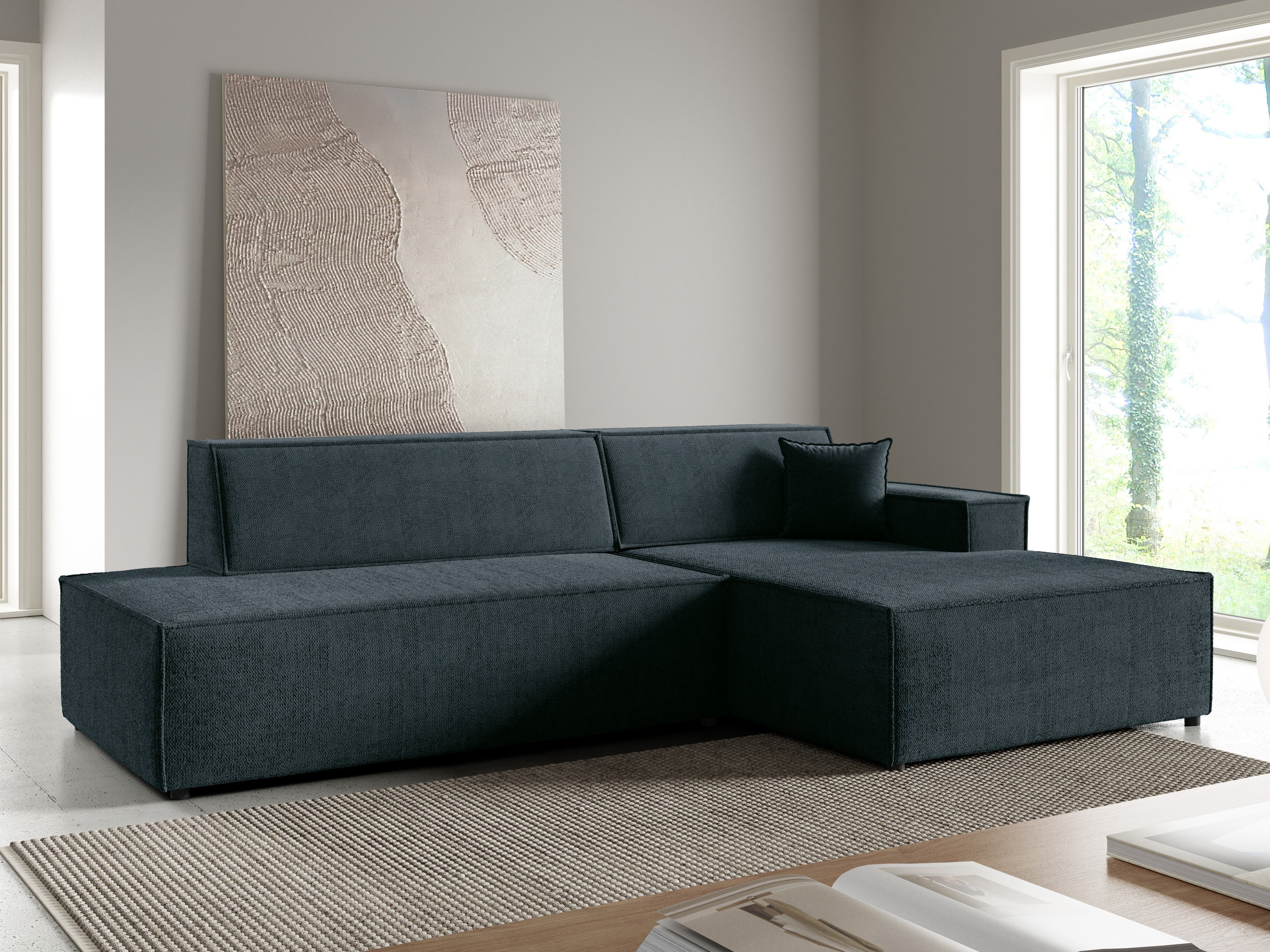Wenn Sie das Sofa von vorne betrachten, befindet sich der verlängerte Teil bzw. die Ecke der rechtsseitigen Option auf Ihrer rechten Seite. Die gewählte Eckoption sollte den Fluss des Raums verbessern und eine einfache Bewegung innerhalb des Raums ermöglichen.